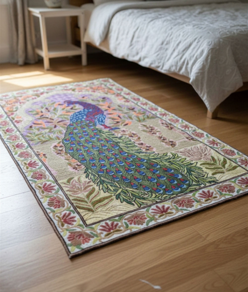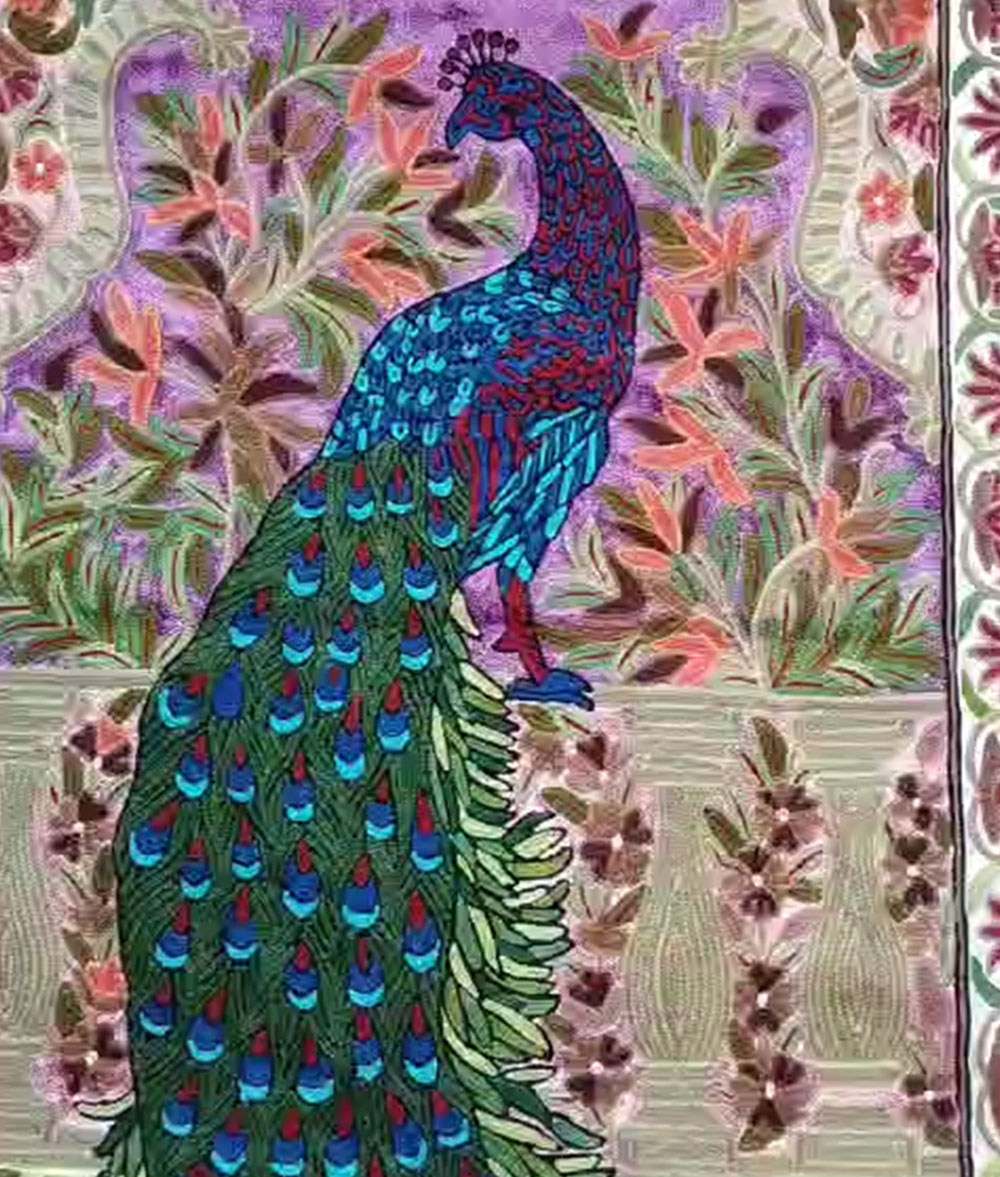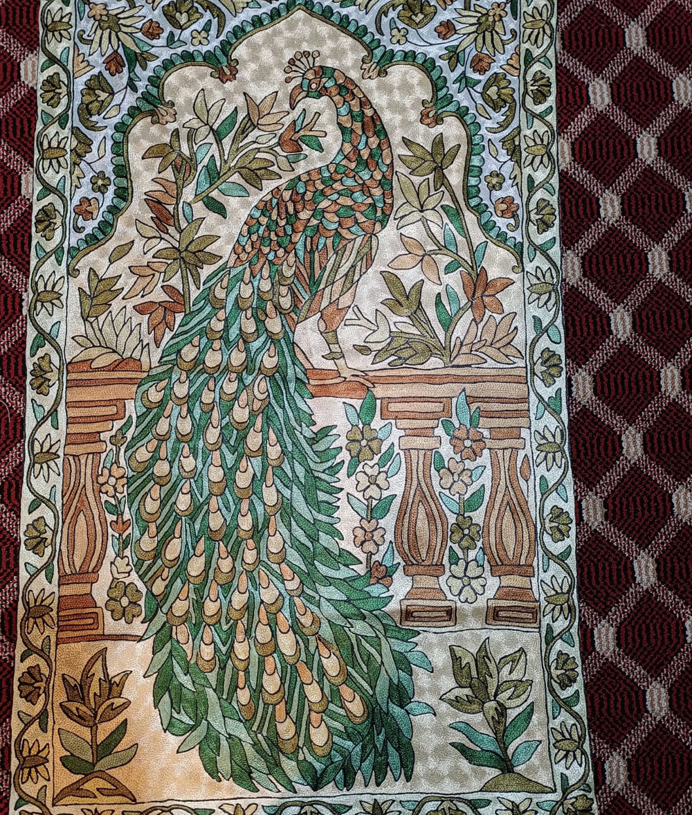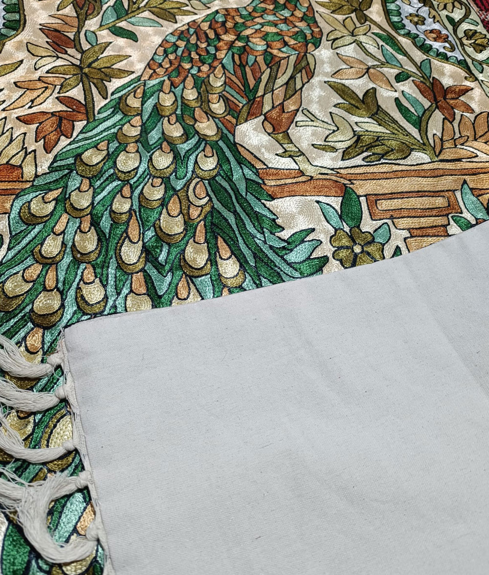 Kashmir handmade silk and cotton Chain stich rug hand stitched Peacock animal design with multiple floral design Meterial…Dosoot Cotton Fabric, Convas, wool thread, Silk thread.