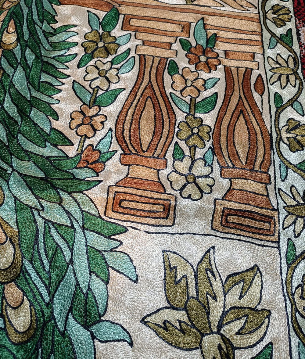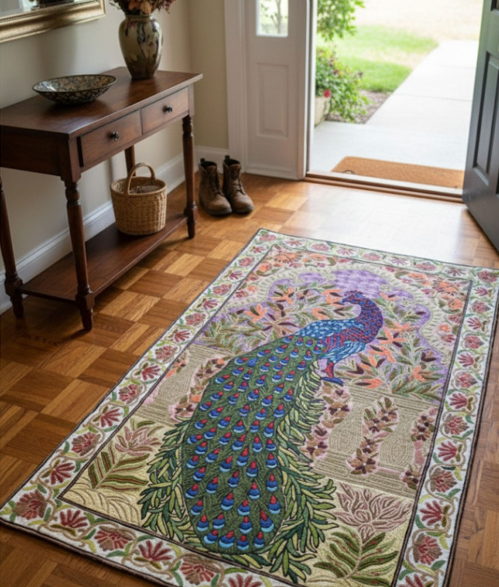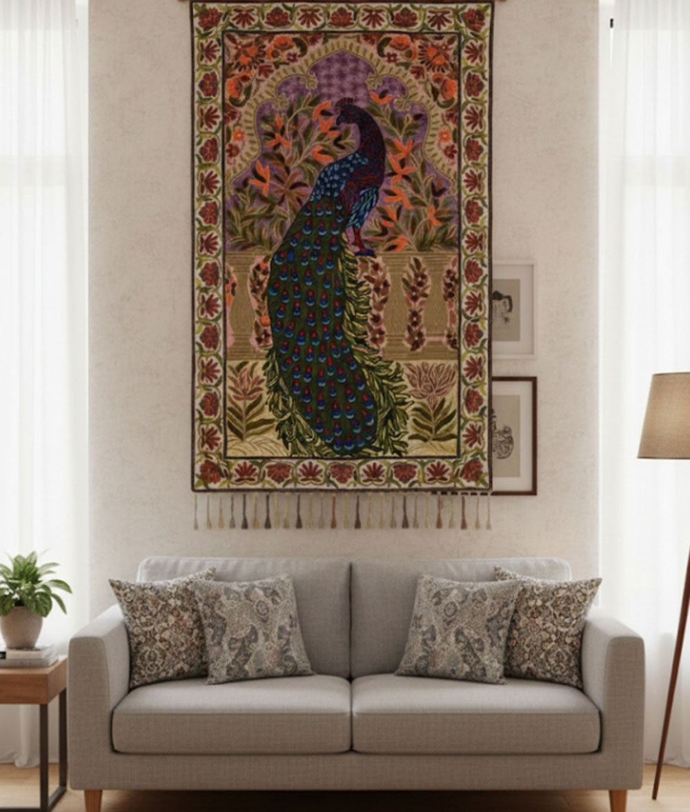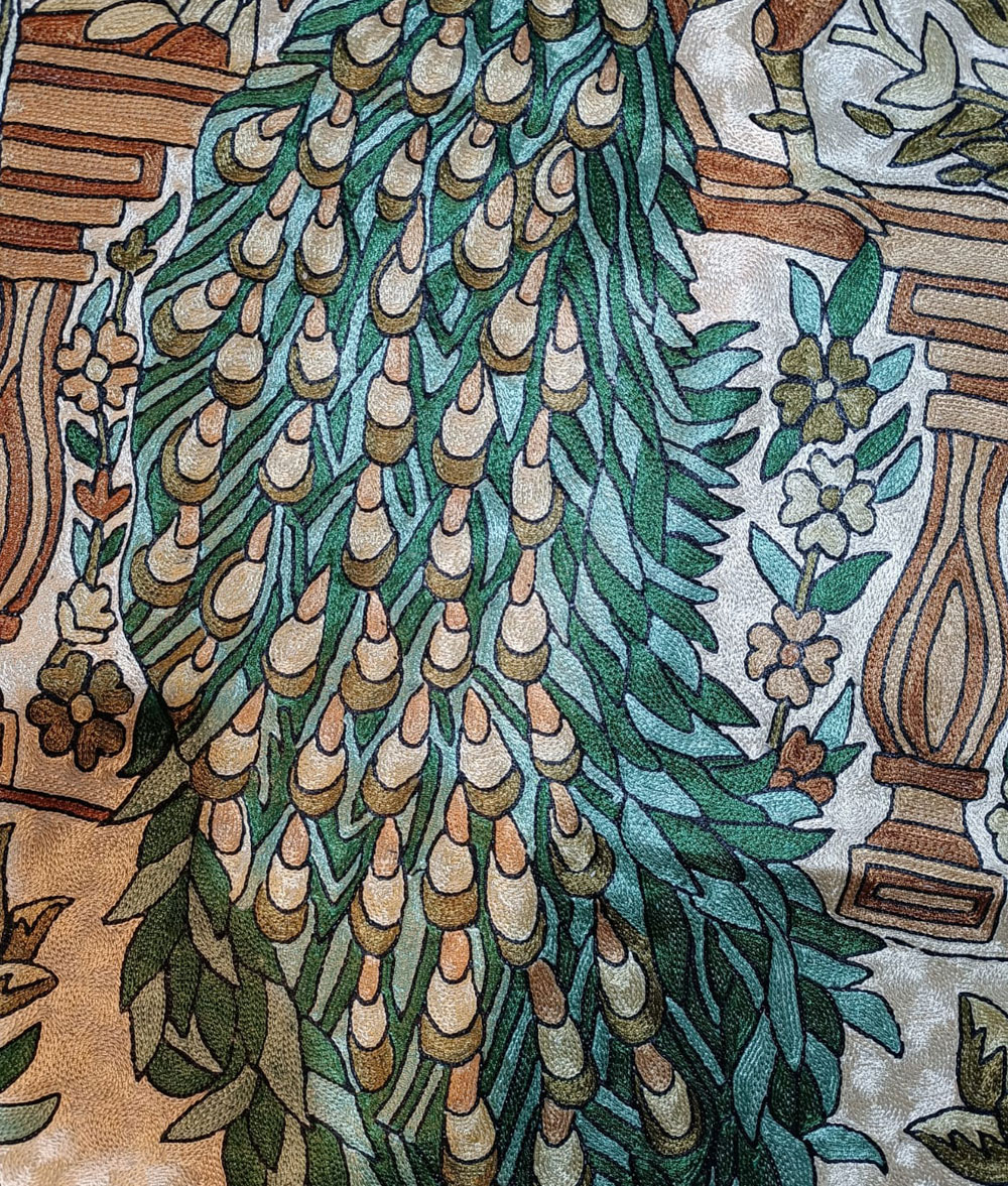 Kashmir handmade silk and cotton Chain stich rug hand stitched Peacock animal design with multiple floral design Meterial…Dosoot Cotton Fabric, Convas, wool thread, Silk thread.